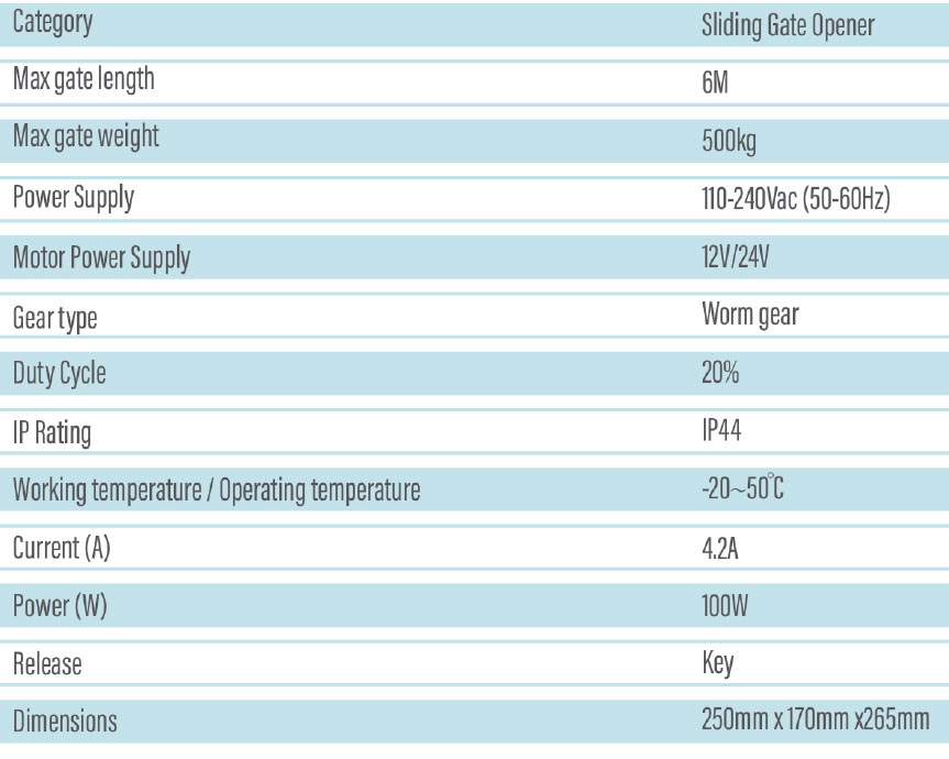 Here are the technical specifications for the Duntech Automation swinging gate motor, DWSOL500.